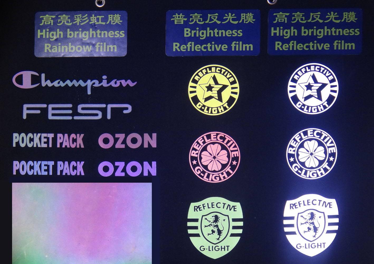 This kind of high visibility rainbow-colored reflective material was invented by Giftstart. It is high visibility. The effect of reflection will become high visibility rainbow-colored light after light on . It’s different from any other reflective materials ,which will become white light or lower visibility colored light after light on.